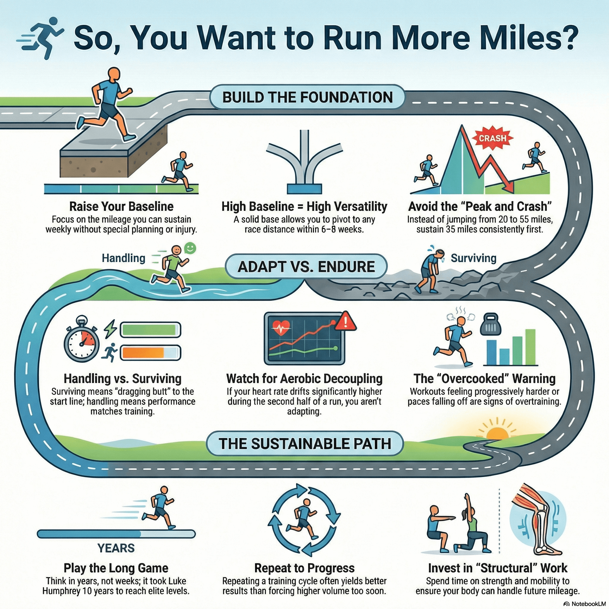 Your goal right now—especially in the “off-season” or between races—should be raising your baseline. If you can get to a point where running 35 or 40 miles a week feels totally normal and easy, you are in a great spot. From there, you are only about 6 to 8 weeks away from being ready to race any distance.